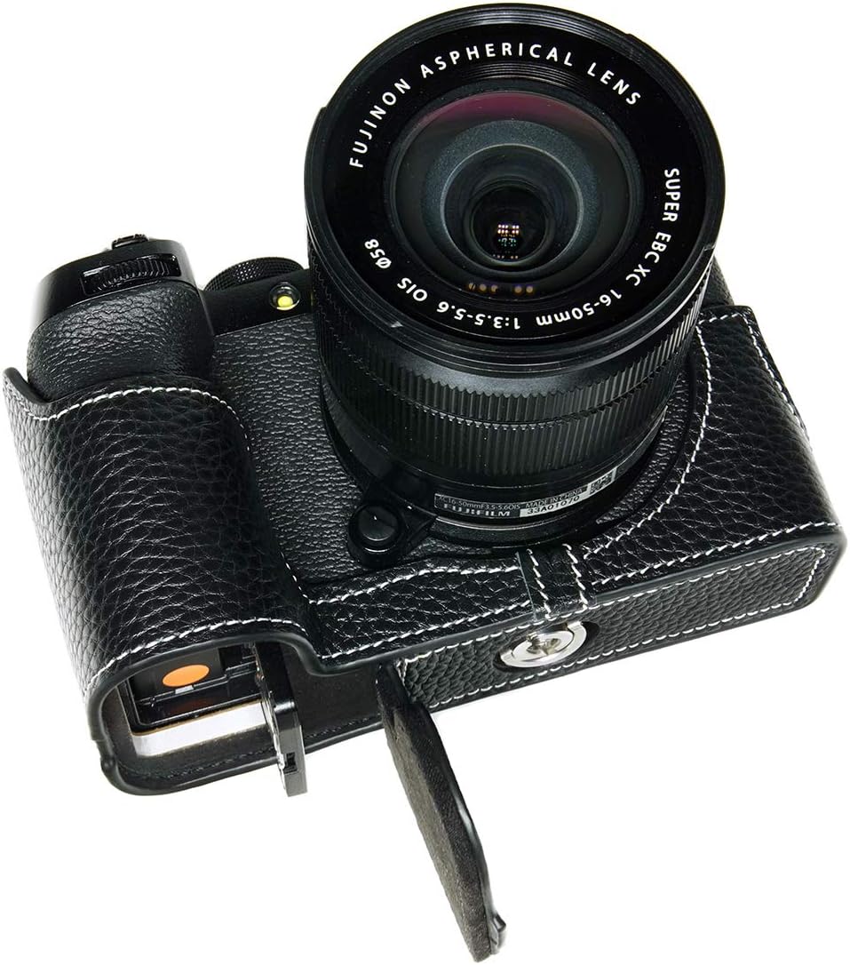This camera is made by real top layer oil leather, the design is simple and vintage, use Metal sizing techniques make it very fit with the camera body. Inside lining use high lever velvet to protect camera body for scratch and coloration. There is a opening on the bottom for battery, You don't need to take off the half case when you change battery. Under base screw is made by copper and it can easy take off by coin. You don't need to take off the half case when you use tripod. It has a special design for Fujifilm Fuji X-S10 XS10 Camera which makes it easy to turn over the Screen and it will totally not affect screen rotation. You don't need to take off the half case when you connect data lines. Content: 1 x camera half case, 1 x Free Genuine Real Leather Hand Strap, camera not included. Material:Genuine leather.