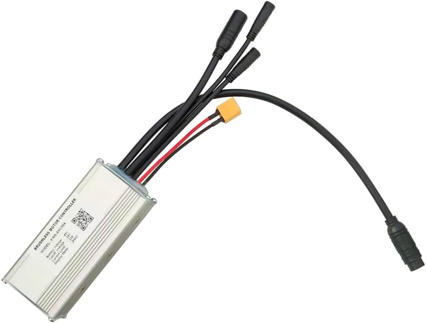 This X109-AXC004 48V 22A electric bicycle controller is compatible with 2HAO protocol display meters. It features terminals for the meter/brake/throttle/switch, brake light/tail light/turn signal, assist function, motor wires, and power supply. It is suitable for electric bicycles, electric mountain bikes, fat bikes, and similar products.