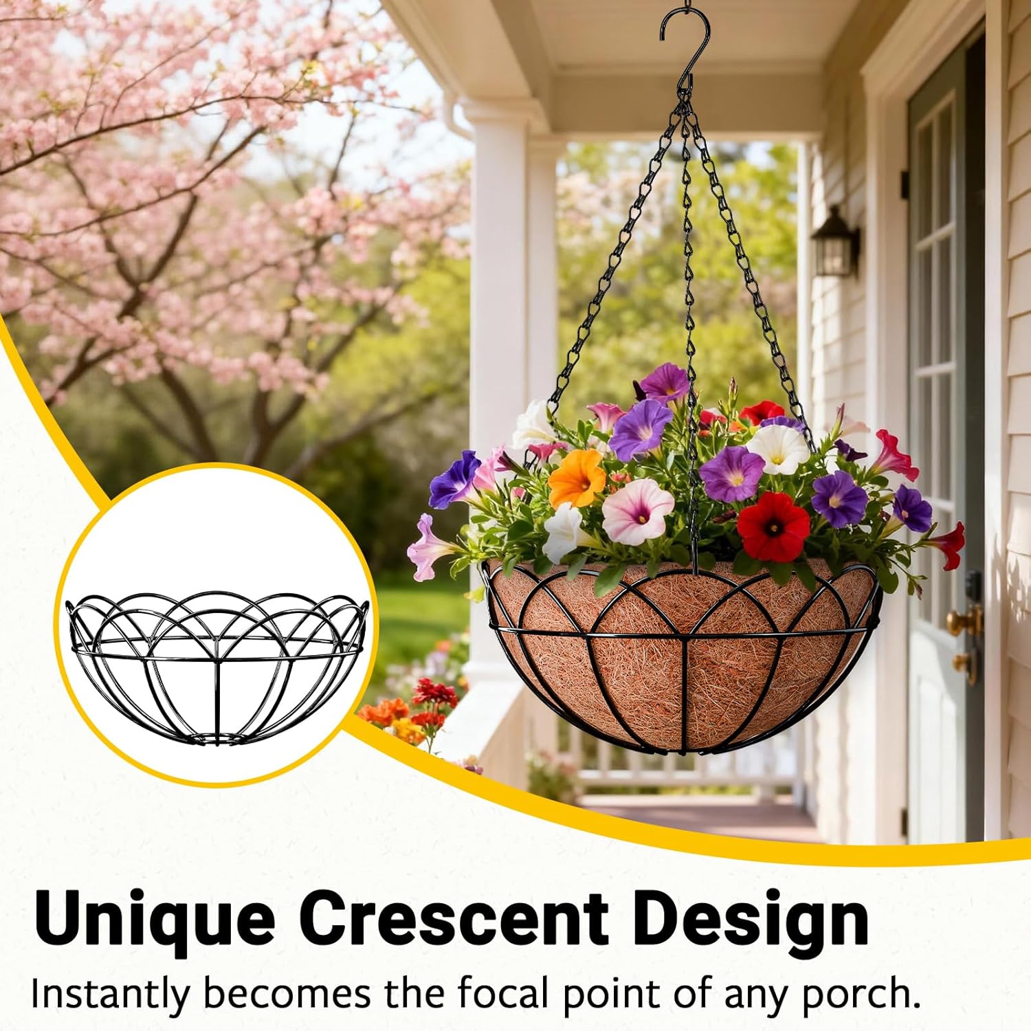 Transform your outdoor space with the ZeeDix Half-Moon Hanging Basket Set. This complete 2-pack includes large 18-inch metal baskets, 100% natural coconut coir liners, and sturdy rust-resistant chains with hooks for instant hanging. Crafted from durable, powder-coated iron, these planters are built to withstand all weather, resisting rust and fading season after season.The breathable coco liners maintain perfect moisture balance, enriching soil with natural vitamins for healthier root growth and vibrant blooms.Effortless to use—simply moisten the liner, place it in the basket, add soil, and plant.Perfect for creating stunning vertical gardens on patios, balconies, porches, or fences with flowers, herbs, succulents, or trailing vines.