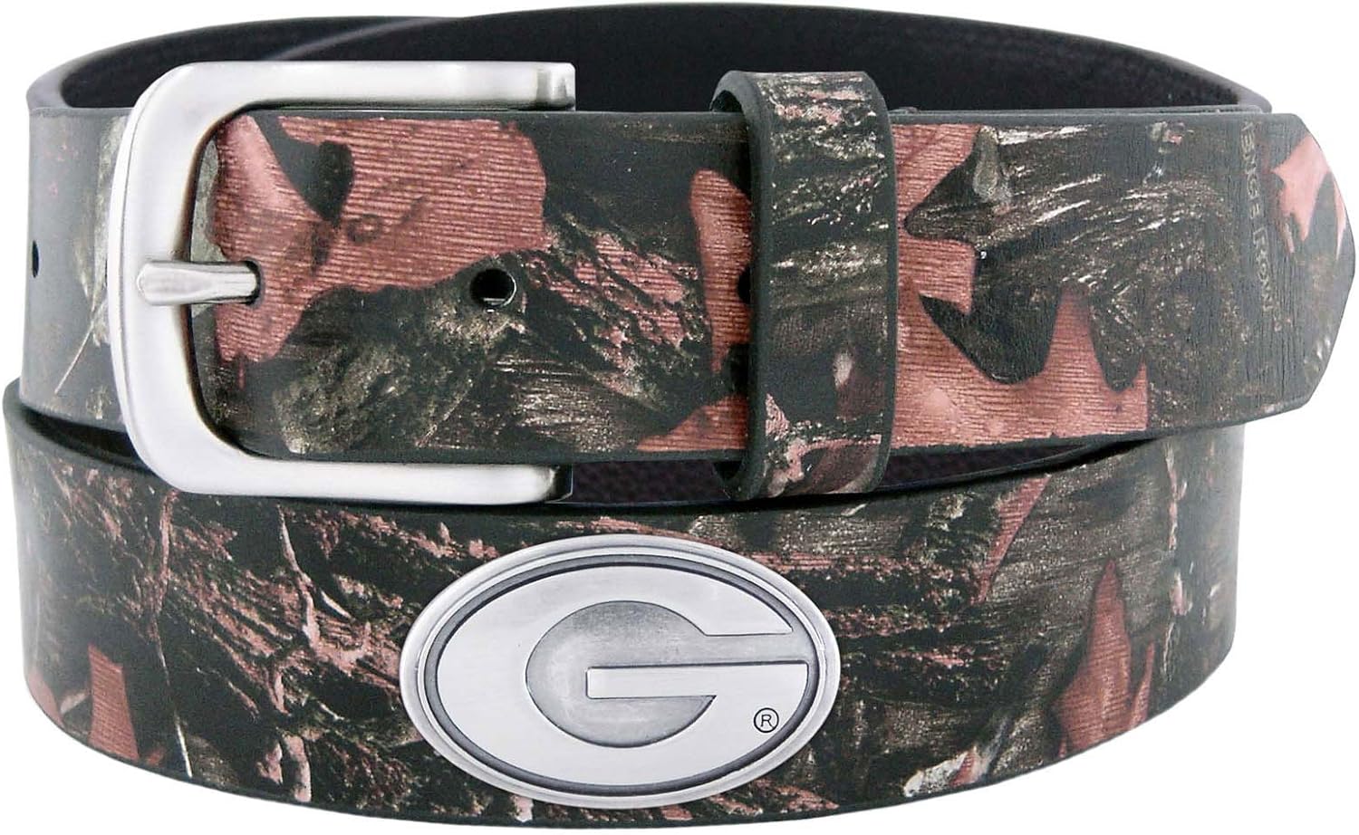 Show off your Georgia Bulldogs school and team spirit with this casual leather belt. A perfect way to accessorize any casual fashion look or gameday event. This genuine leather belt features a brown pull up finish and silver gun metal buckle. Decorated with 4 silver gun metal conchos throughout the belt. Fits shorts and pants that have a minimum loop size of 1.25 inches. Belt size is one size larger than pant size.